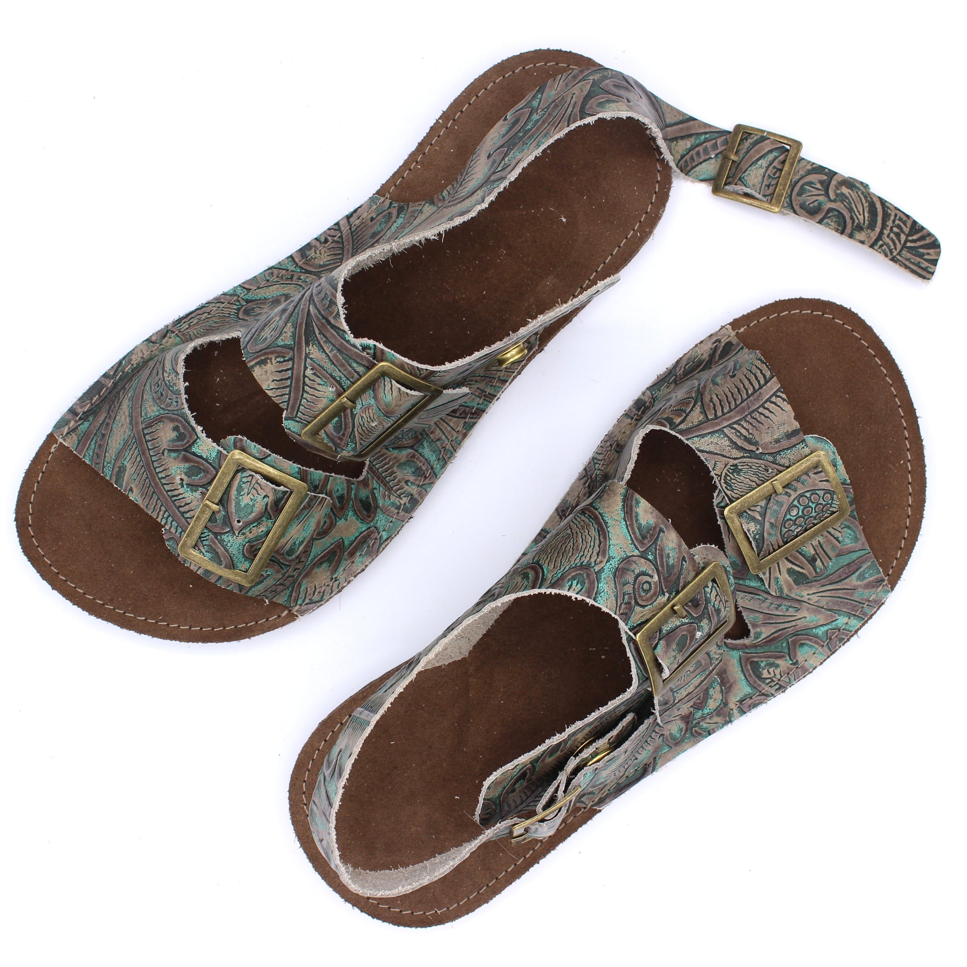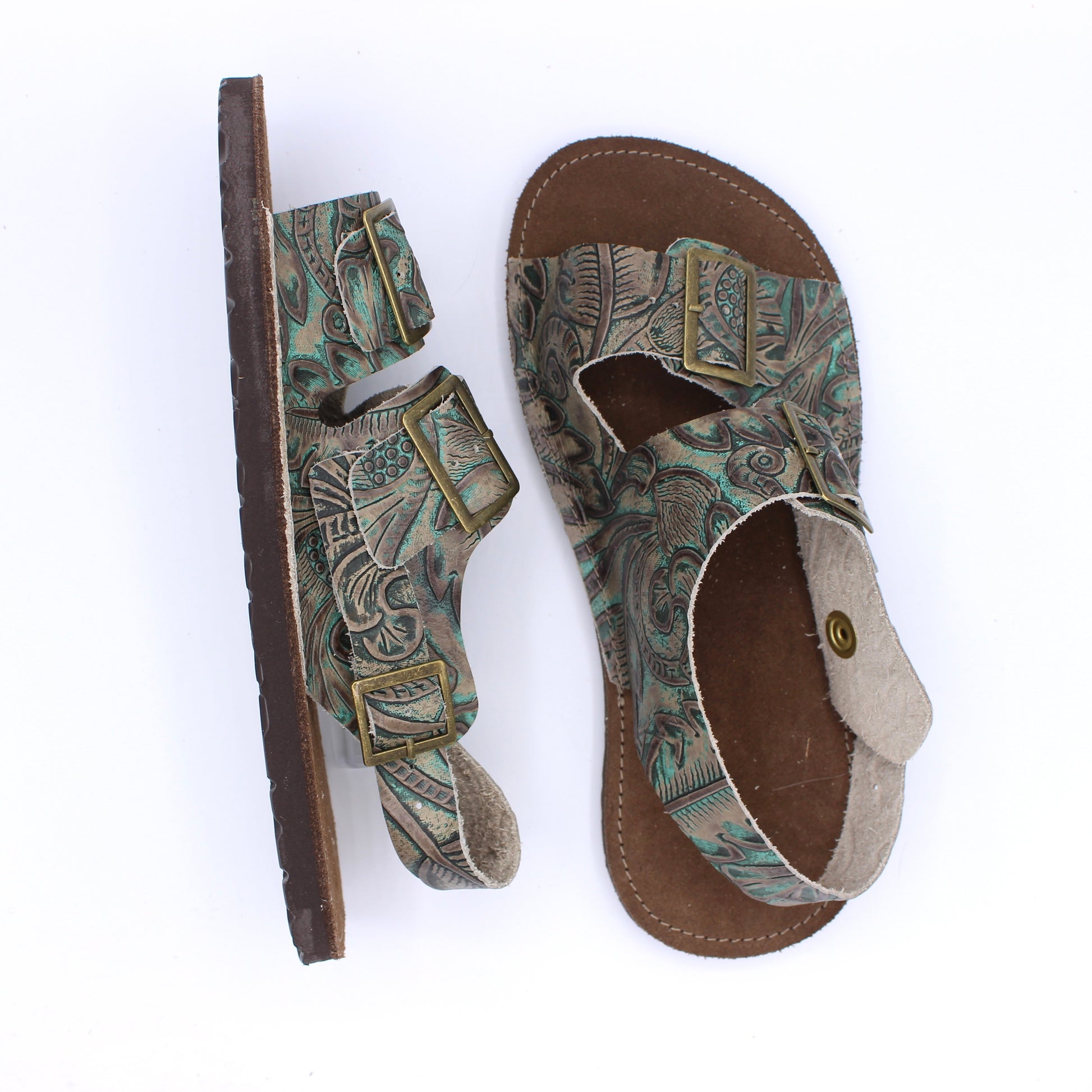 Ladies Buckle Sandals with Snaps - Tooled Teal - - Chocolate midsoles - Dark Brown Rugged Soles