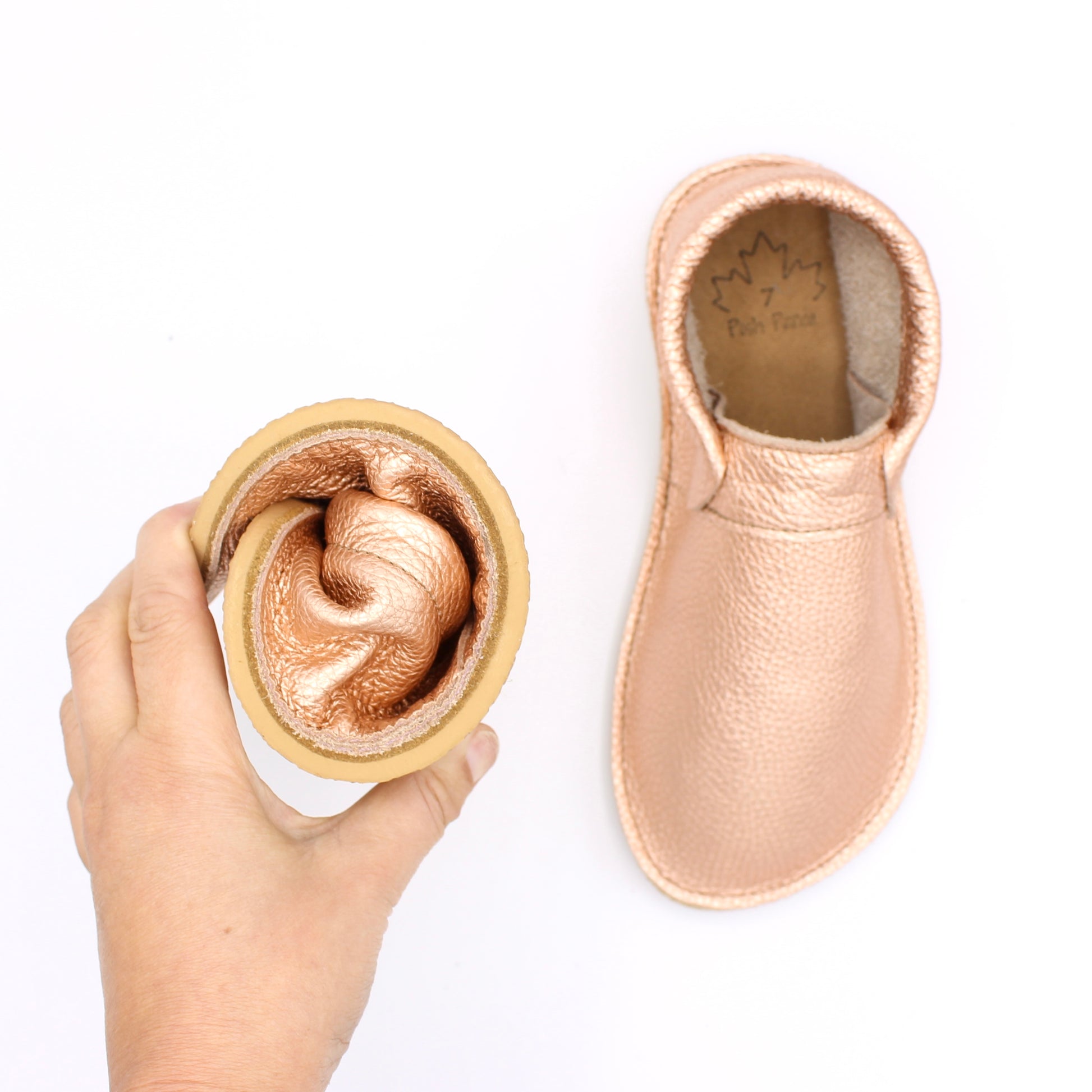 Rose Gold Leather Is a pebble grain leather that is very soft and has a good amount of stretch to it. It has a Metallic finish to the surface and It is the perfect medium thickness that will hold its shape bit also stretch to your foot shape with little wear