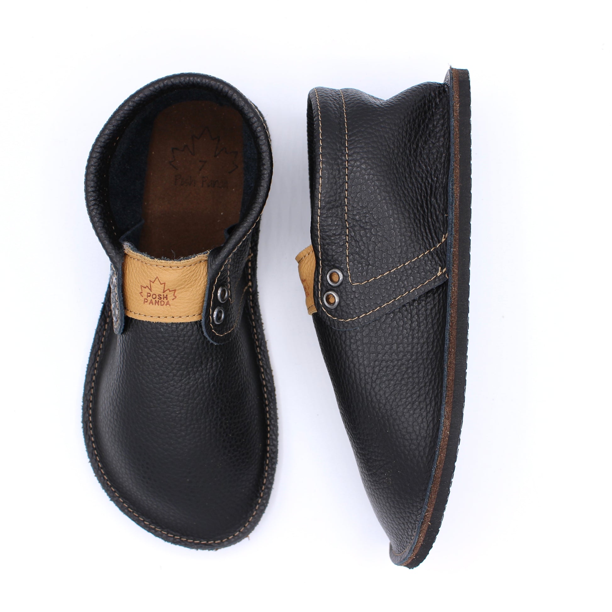 Black Leather: Is a pebble grain leather that is very soft and has a good amount of stretch to it. It is the perfect medium thickness that will hold its shape bit also stretch to your foot shape with little wear