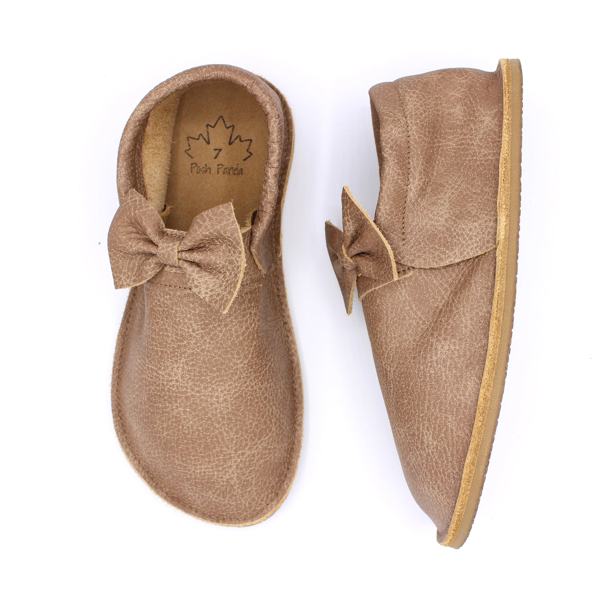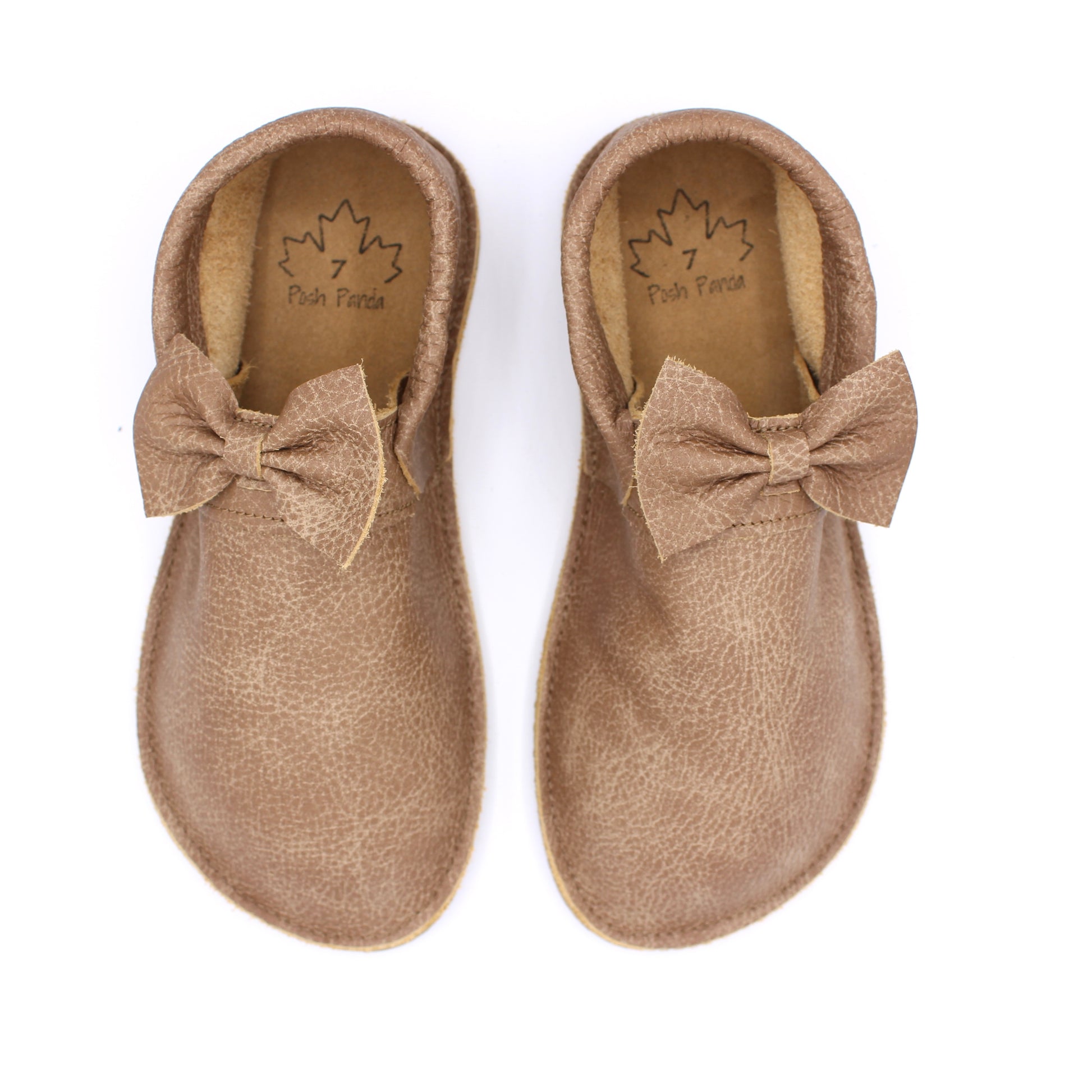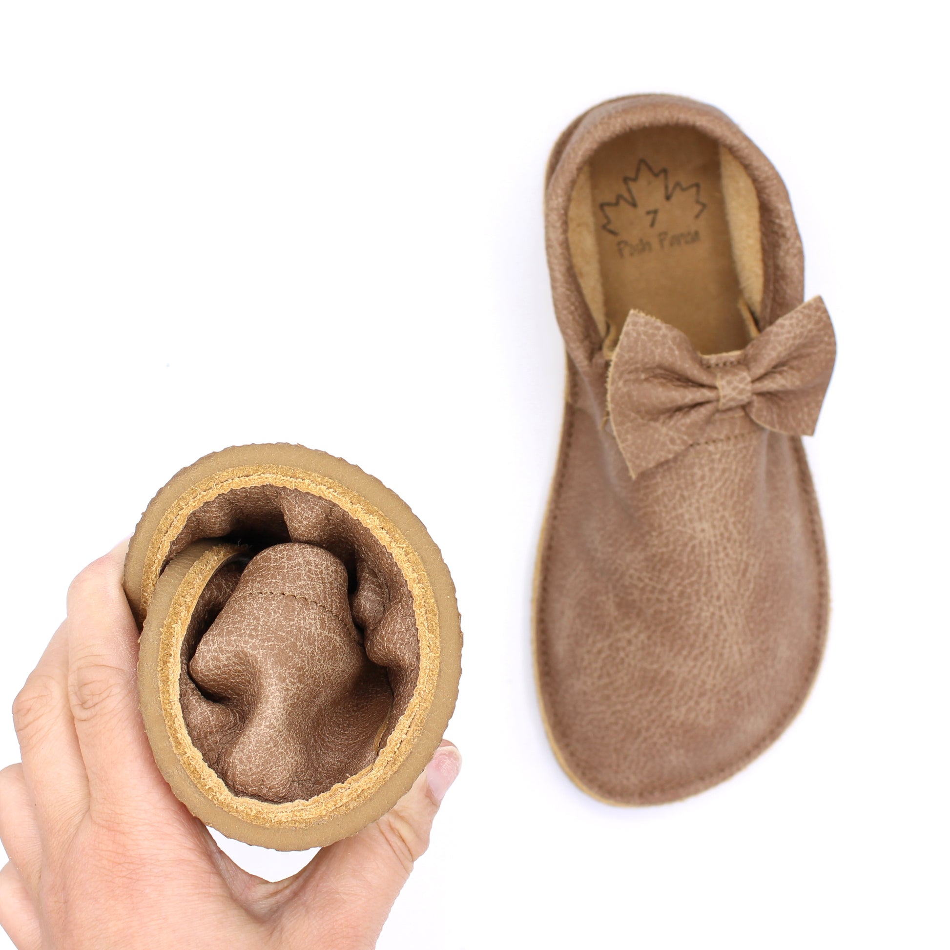 Portobello Leather: This is a weathered/aged looking leather that just gets better with time. This leather is a nice thickness but still super soft giving it a bit of structure but still will stretch and form to your feet like a glove (Very similar to our original mushroom leather)
