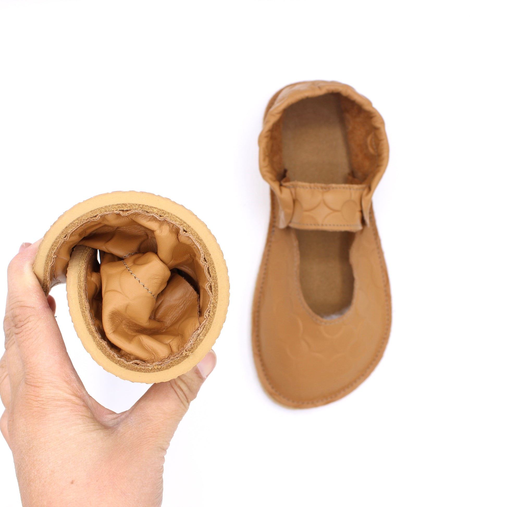 Tan Daisy Leather Is an embossed leather that is very soft and has a good amount of stretch to it. It is slightly thinner leather so it will stretch to your foot shape with very little wear